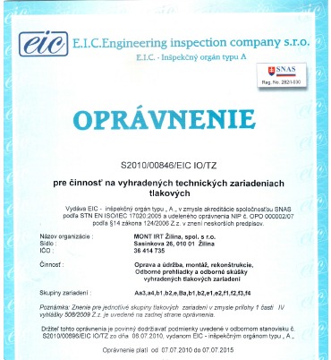 • Výroba, montáž, odborné prehliadky a odborné skúšky tlakových zariadení a nádrží