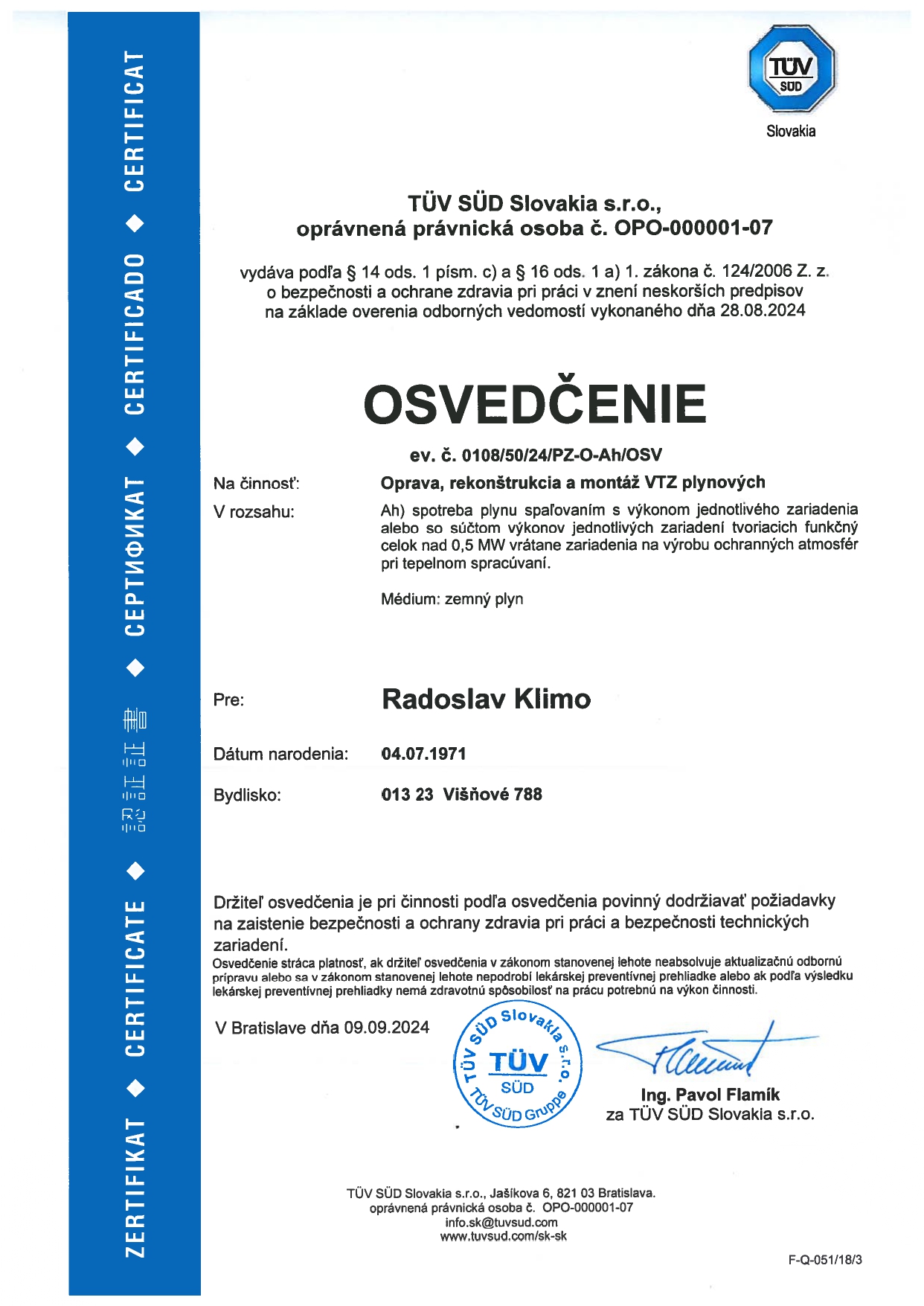 • Rekonštrukcia, oprava, údržba, odborné prehliadky a odborné skúšky tlakových zariadení