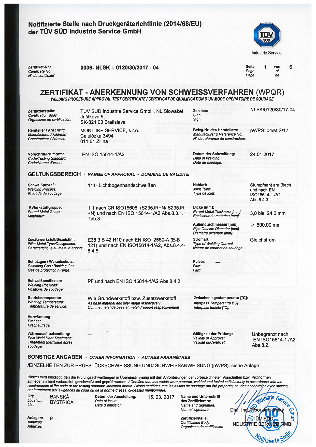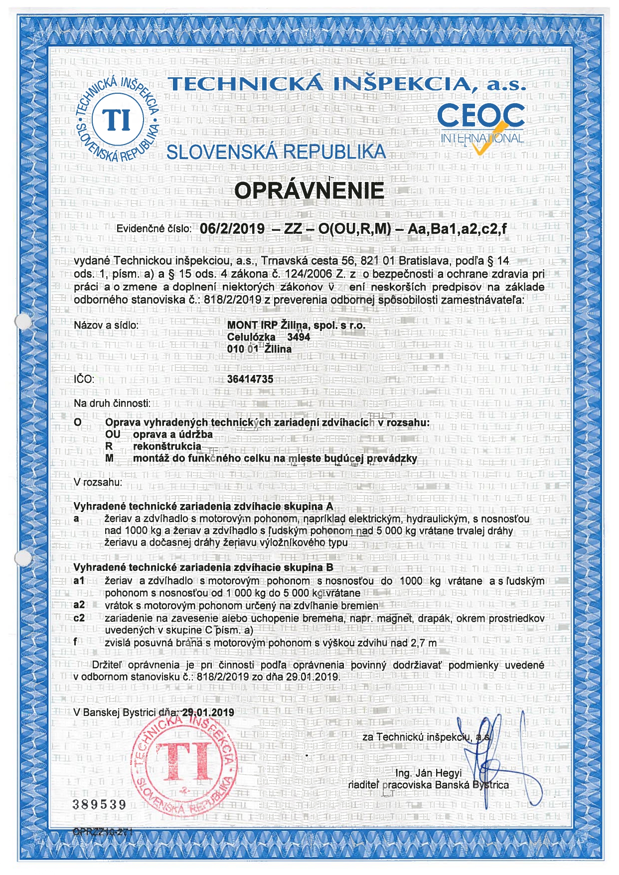 Spoločnosť MONT IRP SERVICE, s.r.o. MONT IRP Service bola v marci 2007 certifikovaná spoločnosťou SGS Slovakia podľa systému kvality ISO 9001. Táto skutočnosť potvrdzuje snahu spoločnosti poskytovať služby svojim klientom na najvyššej úrovni.